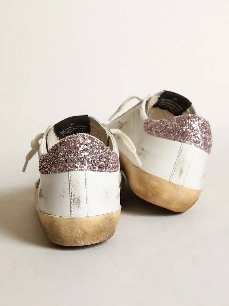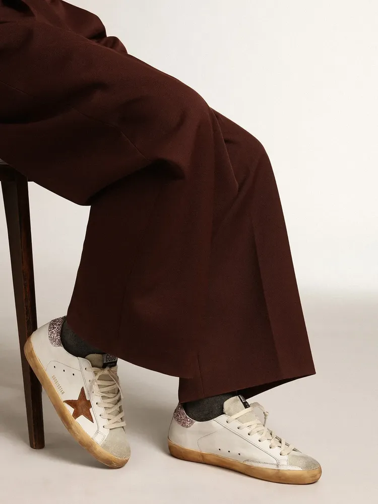 A timeless icon yet one that’s constantly evolving. At Golden, we love taking our classics and reworking them all the time, always from a new angle. This model with a white leather upper features a tan leather star and a pink glitter heel tab. The ice-gray suede tongue and cream laces add the finishing touch.